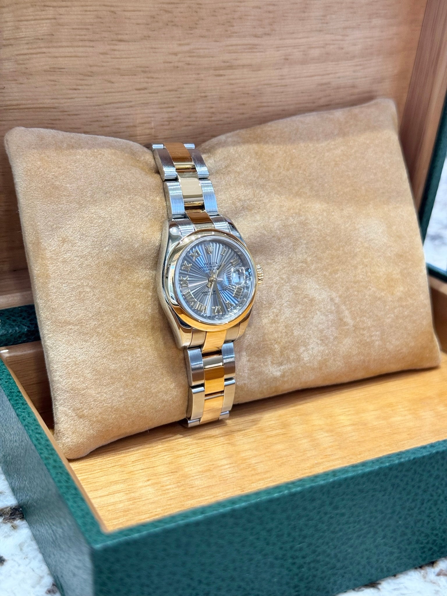 Dial: Silver sunbeam dial with Roman numerals. Date calendar at 3 o’clock aperture.