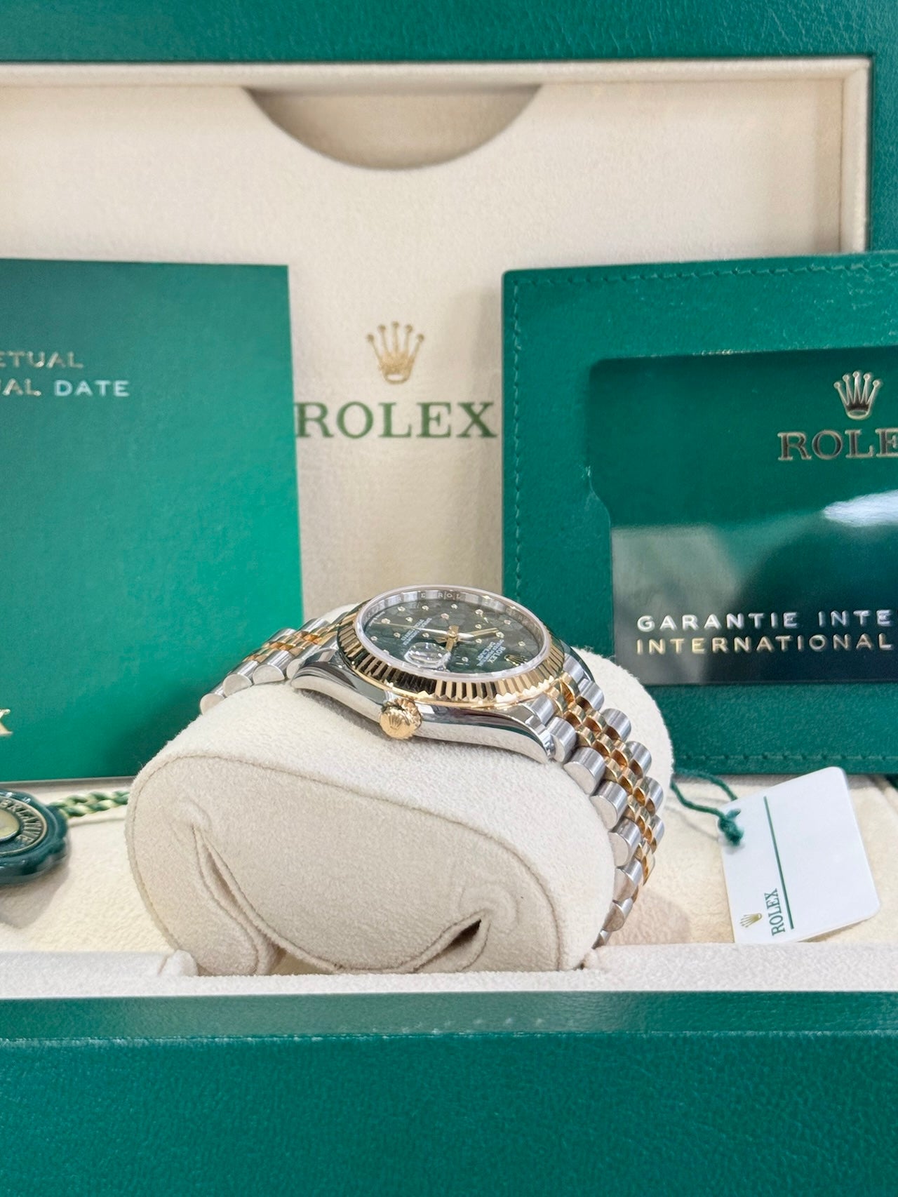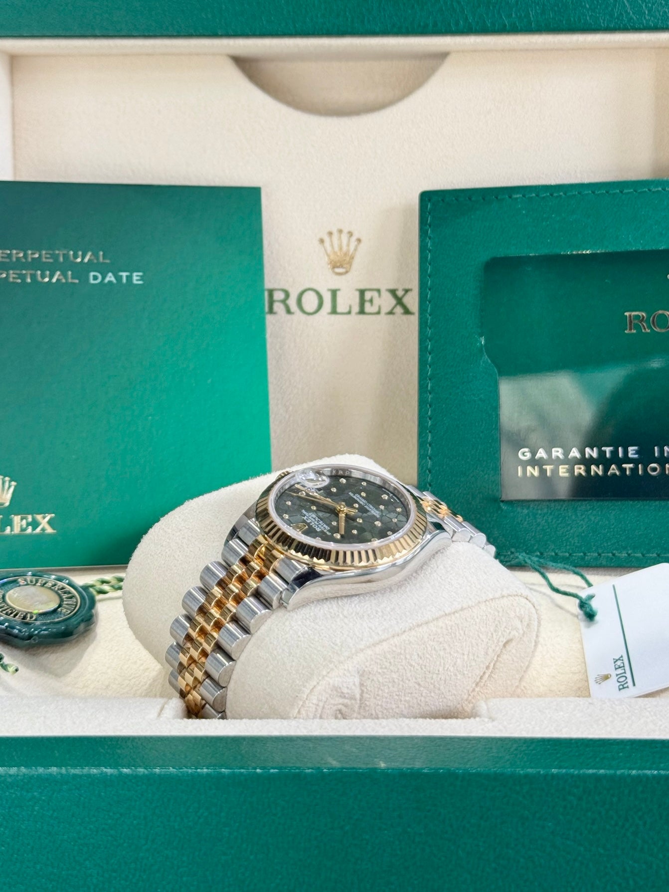 Dial: Olive dial with floral motif set with diamonds. Date calendar at 3 o’clock aperture.