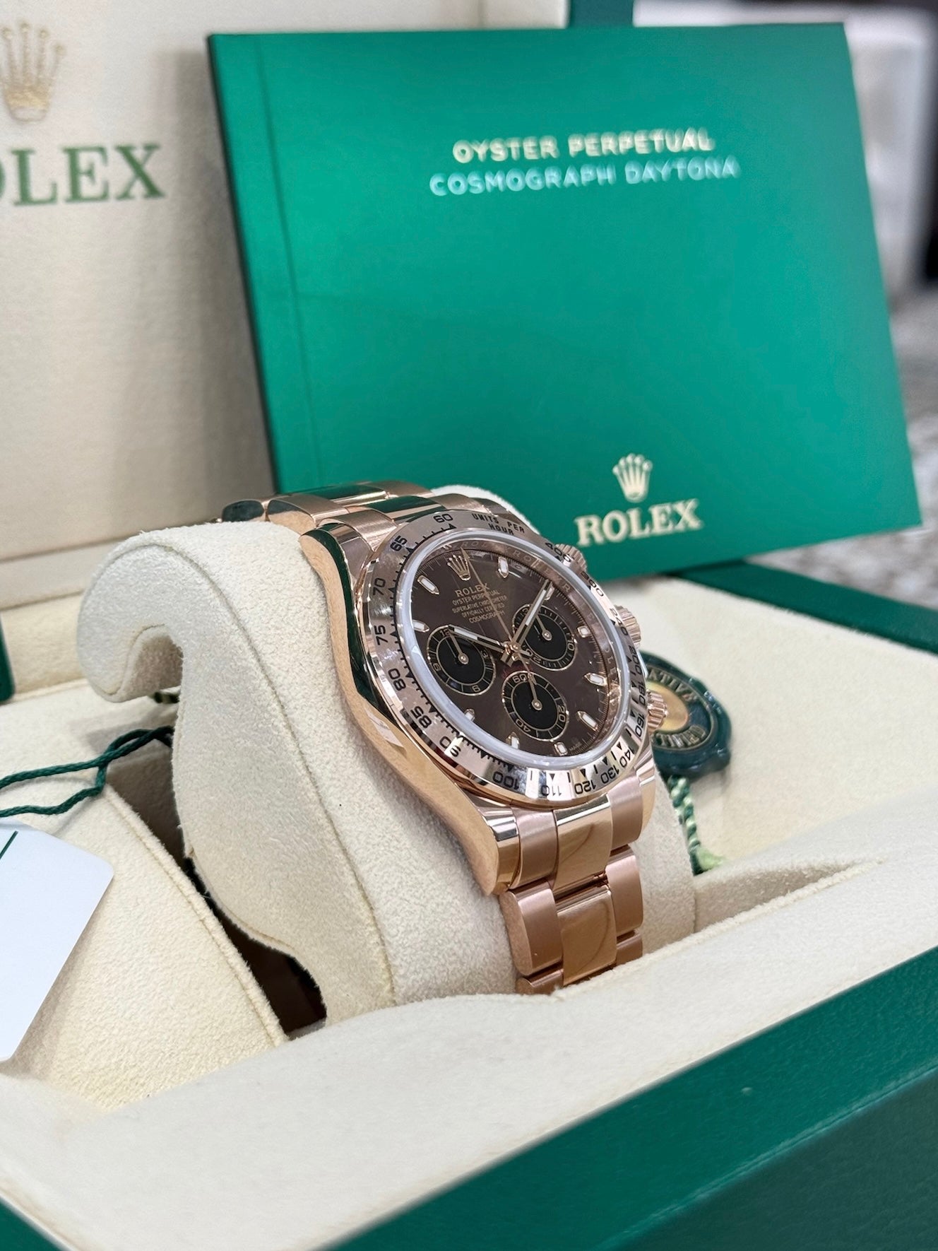 Case: 18ct Everose gold 40mm in diameter. Rolex logo on crown