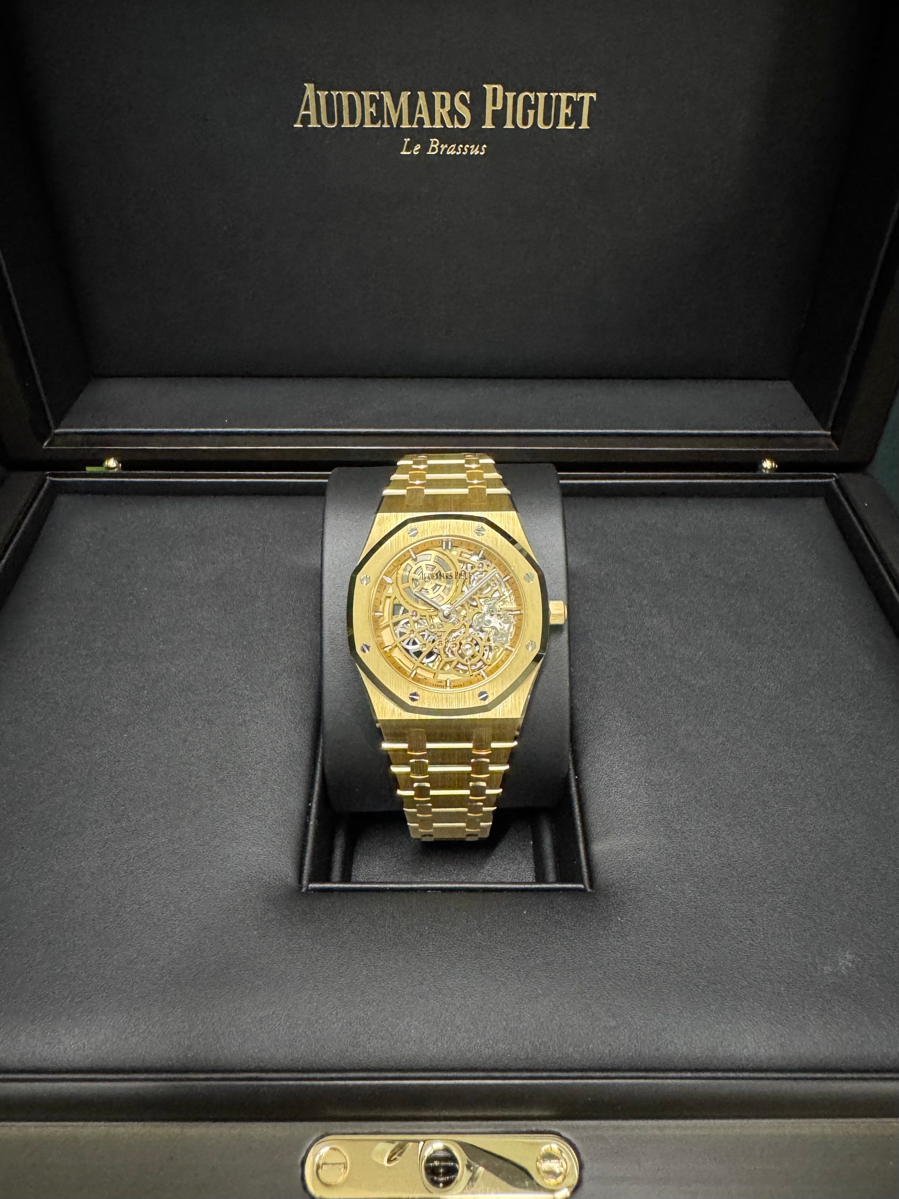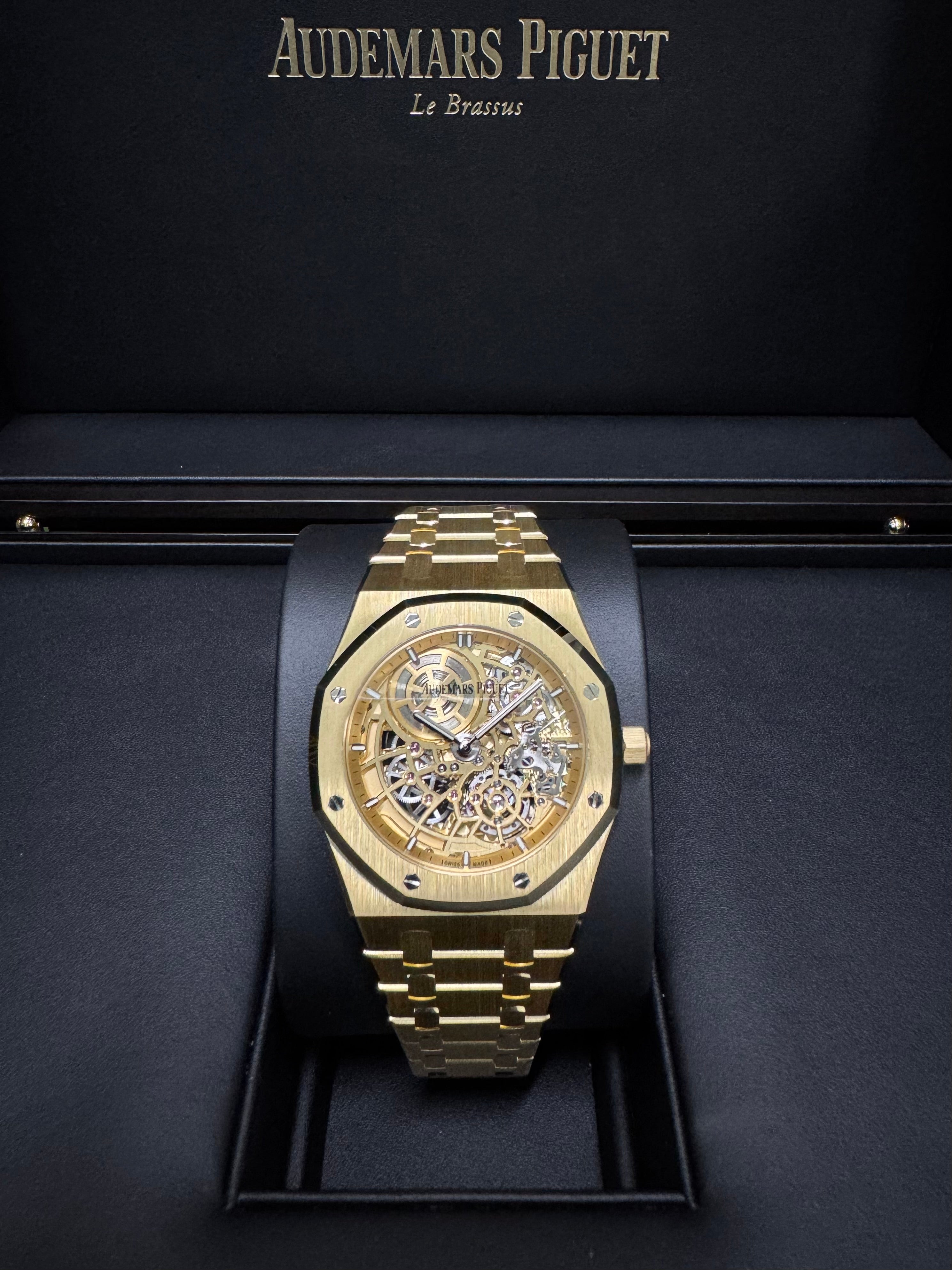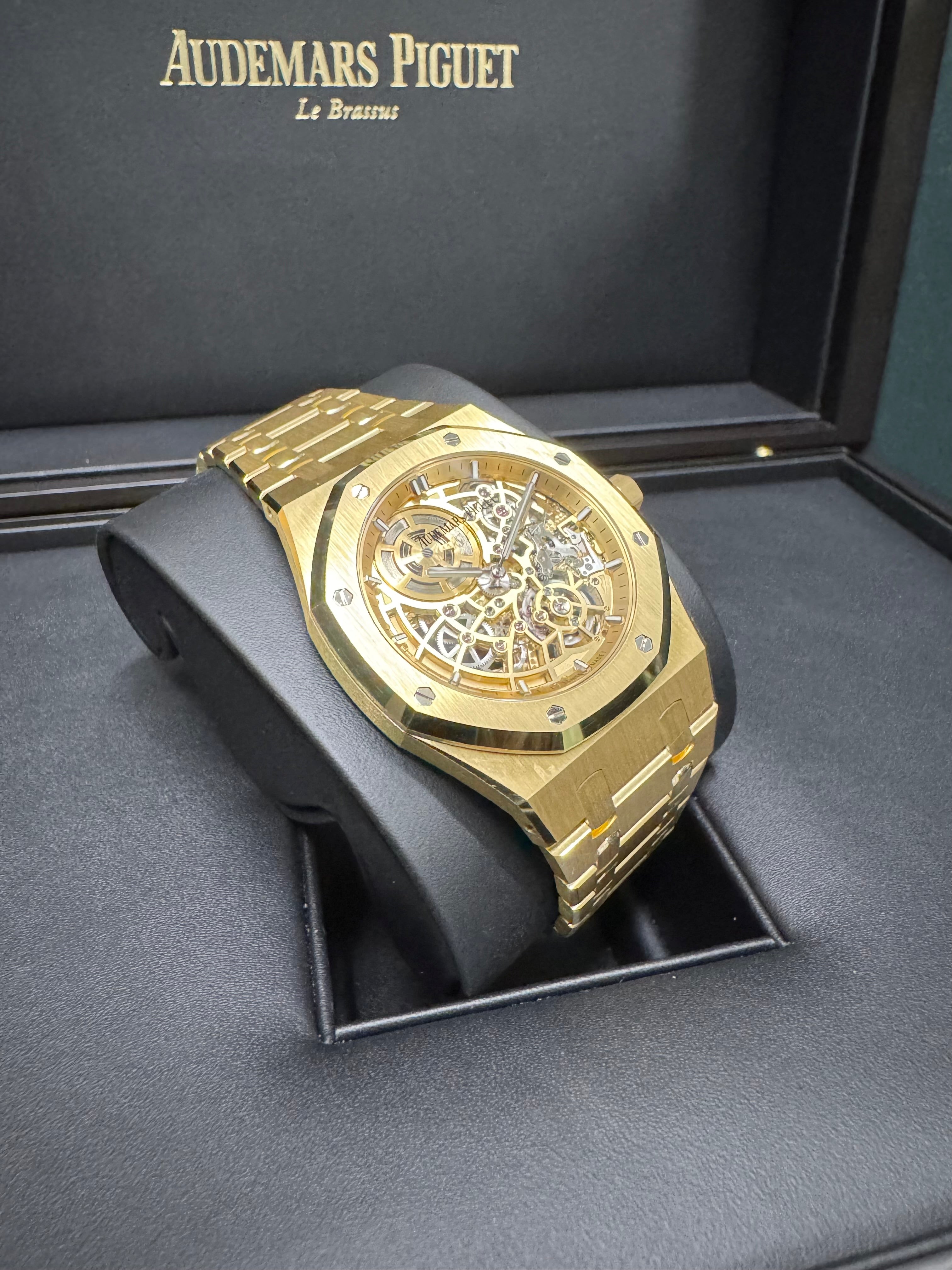 Dial: Yellow gold-toned openworked dial, white gold applied hour-markers and Royal Oak hands with luminescent coating.