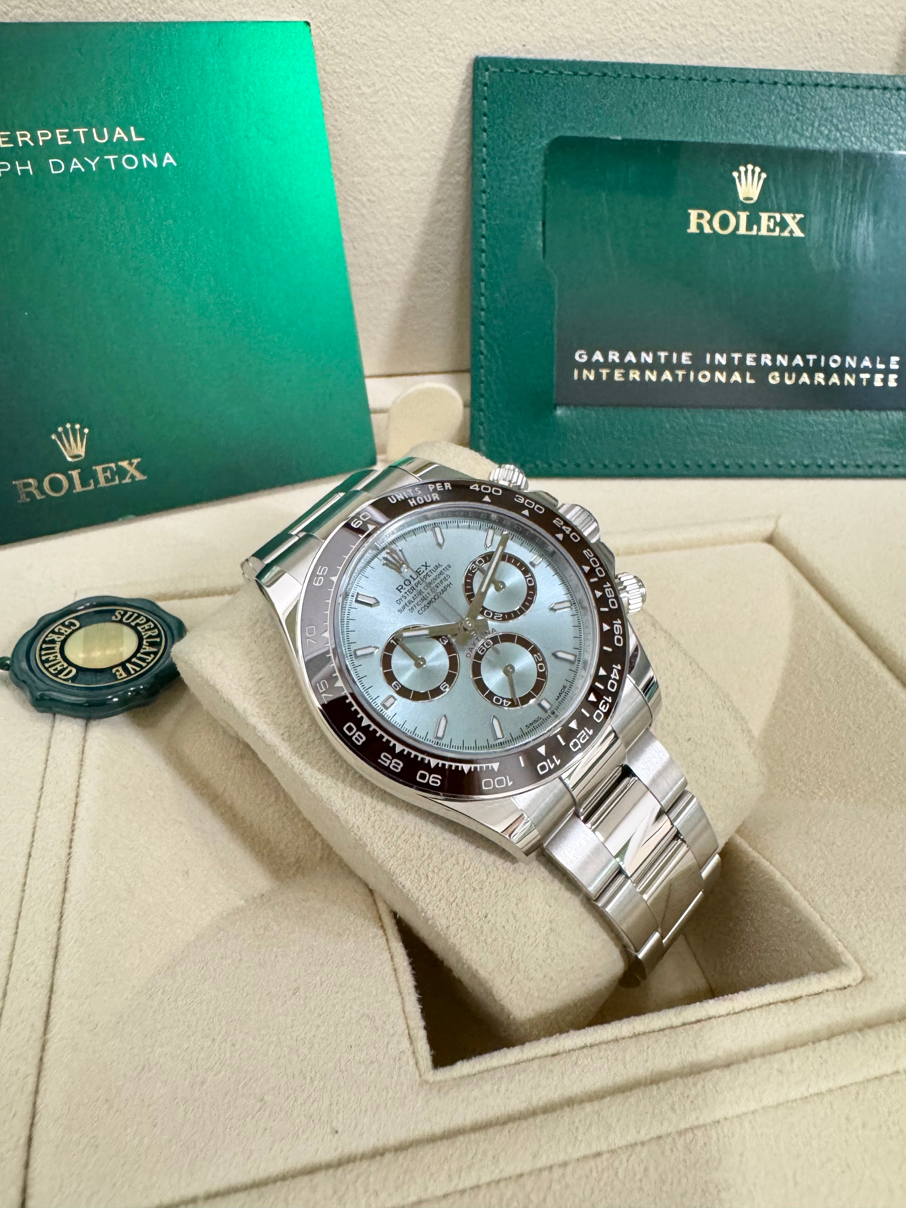 Case: Platinum case 40mm in diameter. Rolex logo on crown