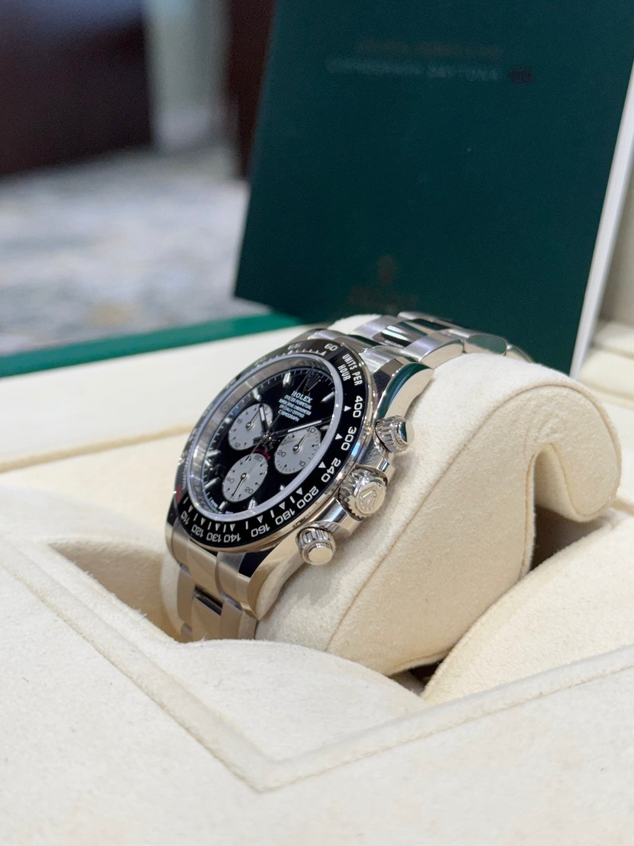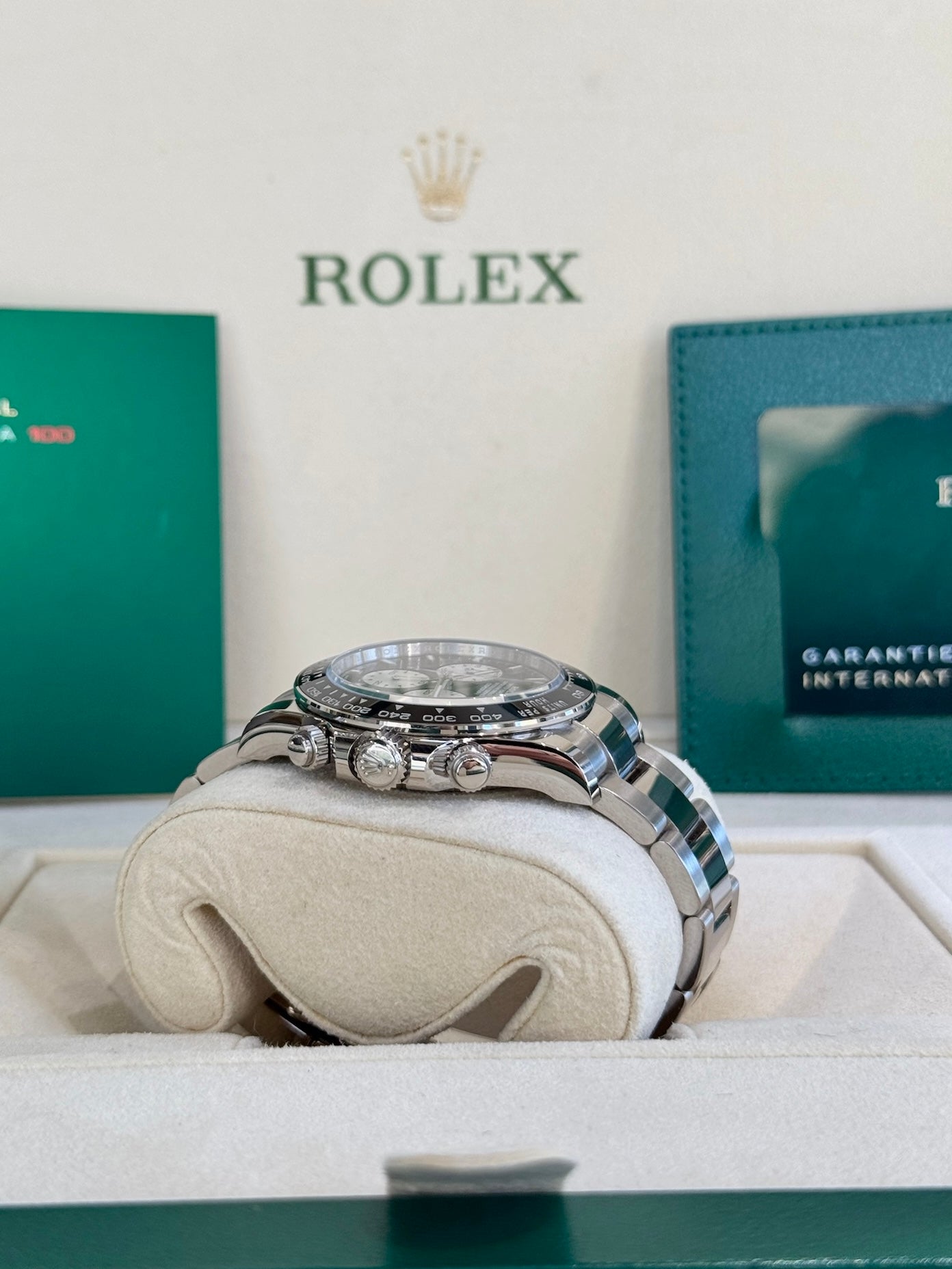 Case: 18ct white gold case 40mm in diameter. Rolex logo on crown