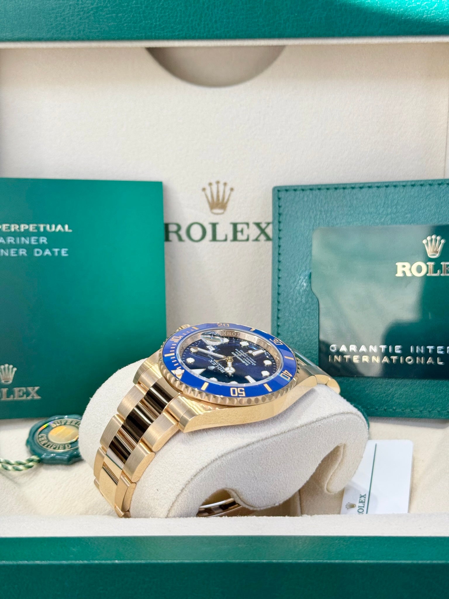 Bezel: Unidirectional blue ceramic bezel with 60 minute graduation. Inner engraved Rolex bezel ring