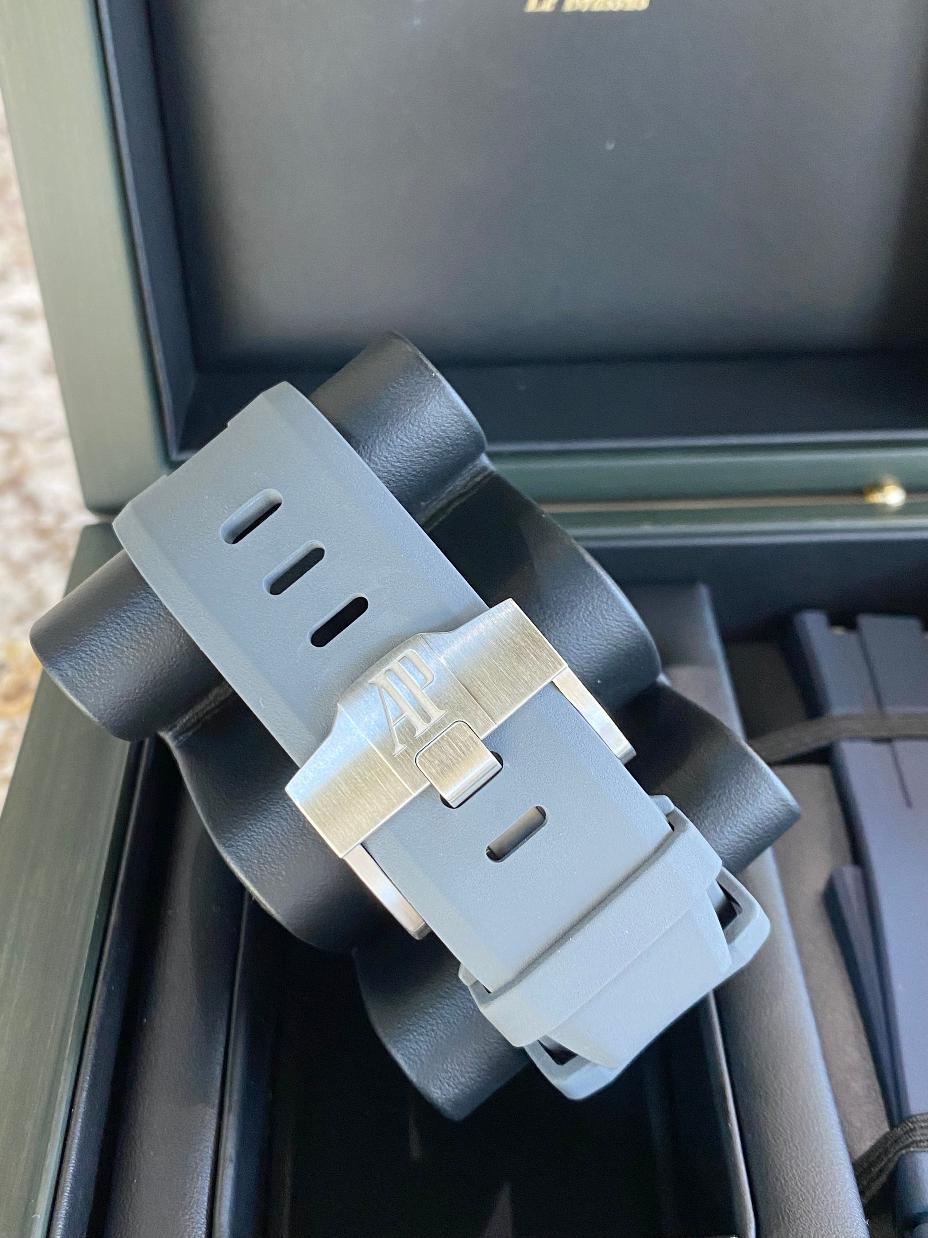 Dial: Grey dial with “Méga Tapisserie” pattern, white gold applied hour-markers and Royal Oak hands with luminescent coating, blue rotating inner bezel with zone from 60 to 15 minutes in white