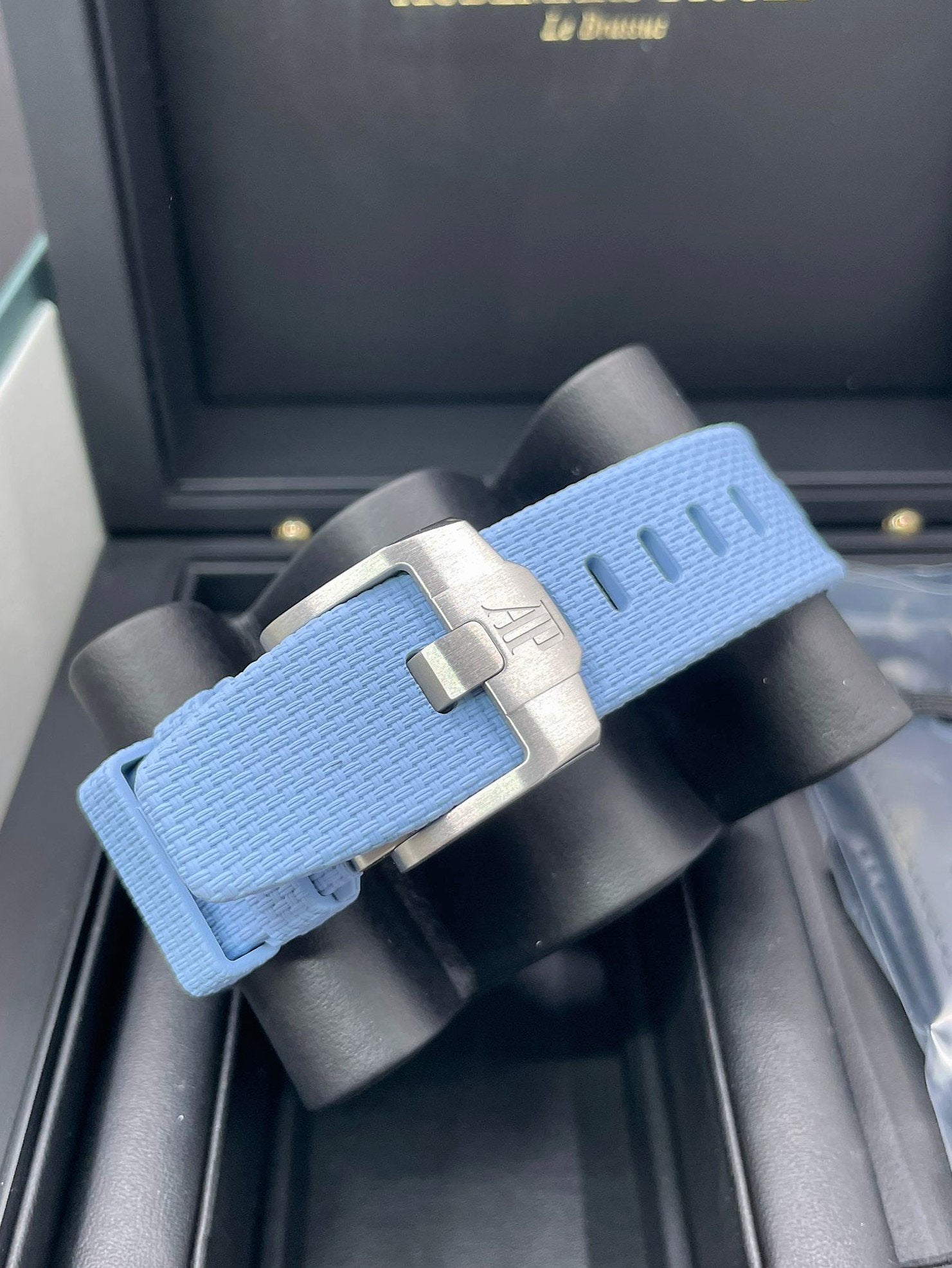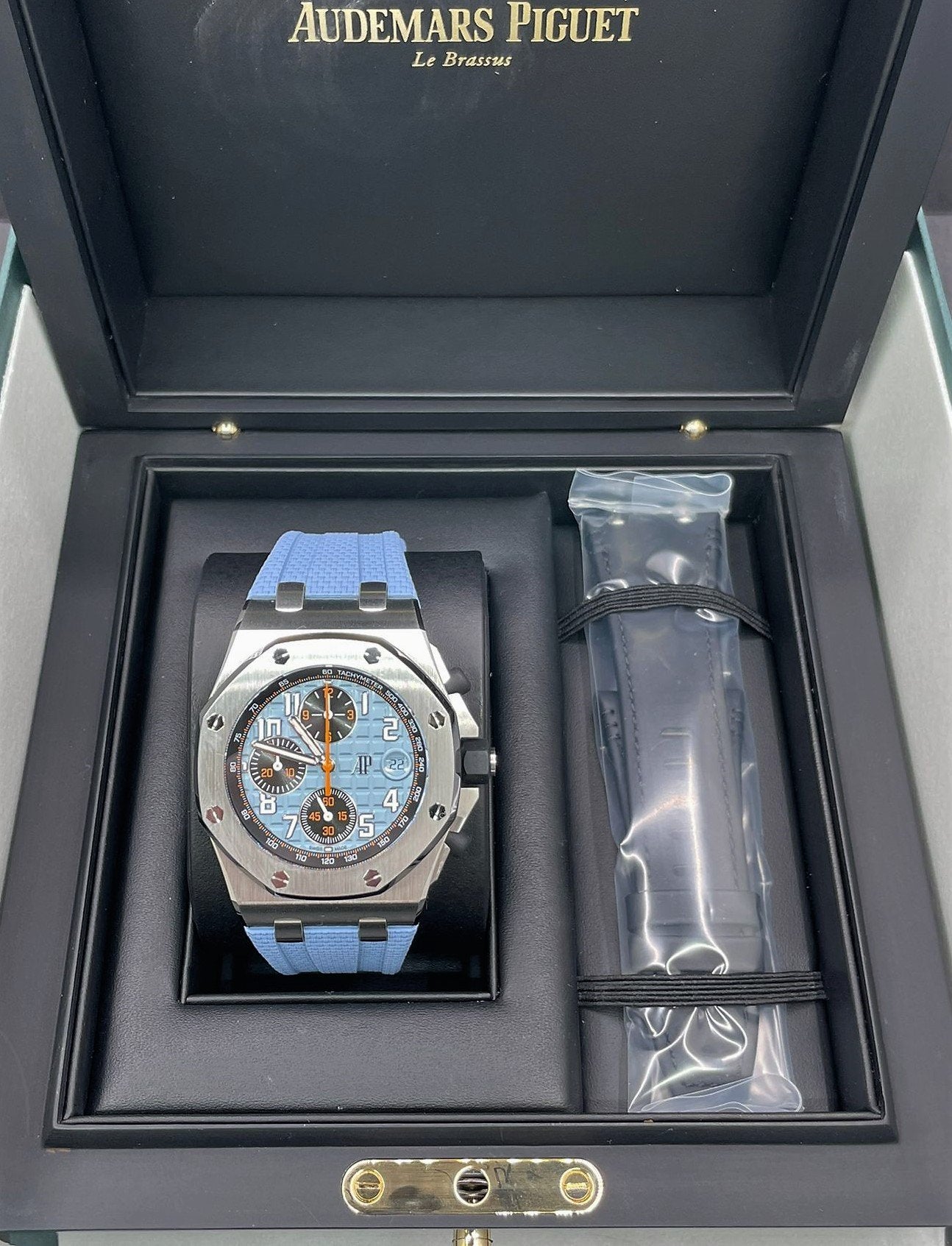 Bracelet: Blue rubber strap with textile decoration with stainless steel AP pin buckle and interchangeable strap system. Additional black calfskin strap