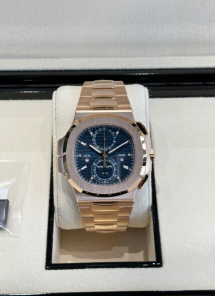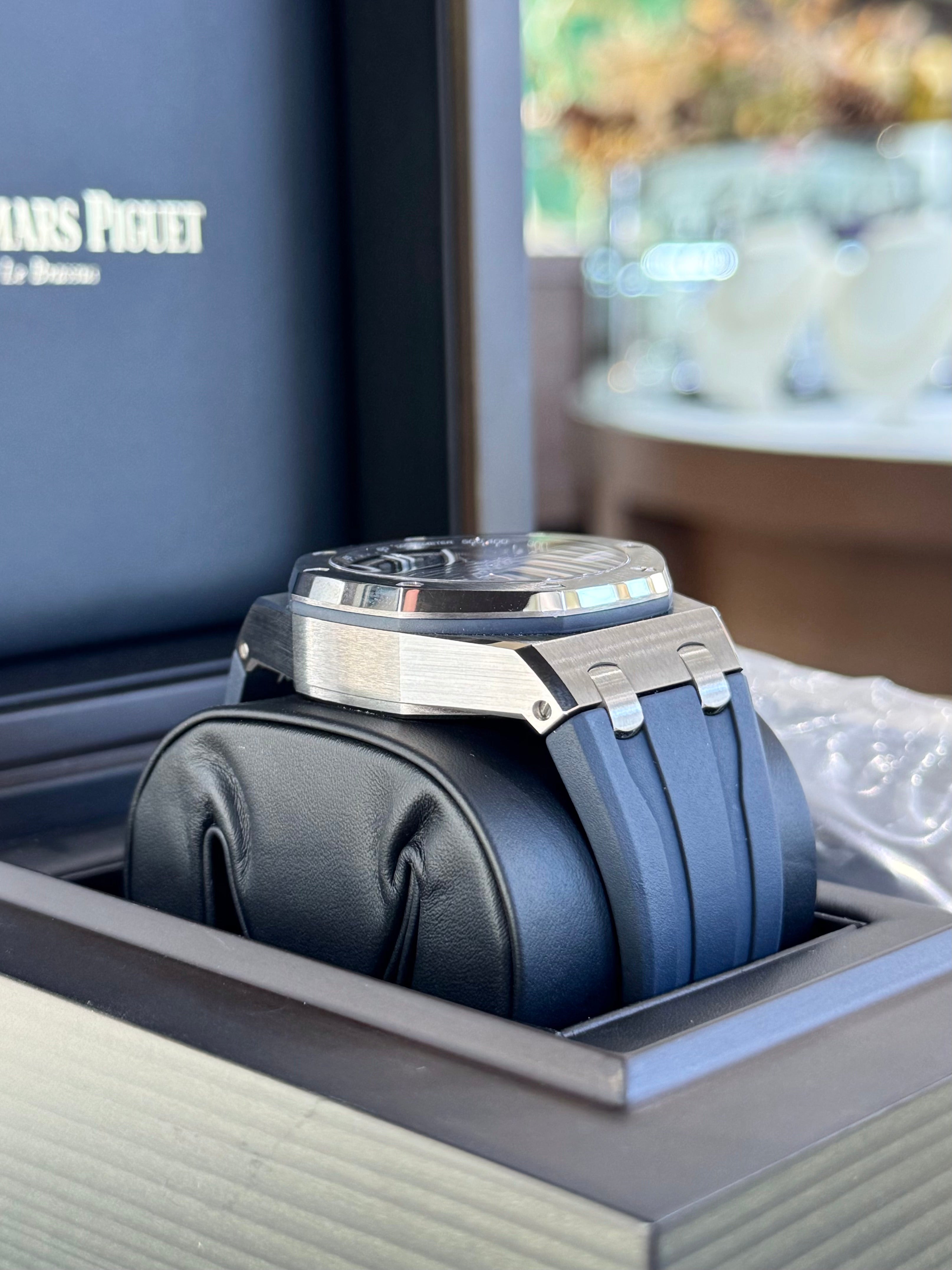 Dial: Blue dial with ‘Mega Tapisserie’ pattern, rhodium-toned counters and external zone, white gold applied hour-markers and Royal Oak hands with luminescent coating. Blue inner bezel.