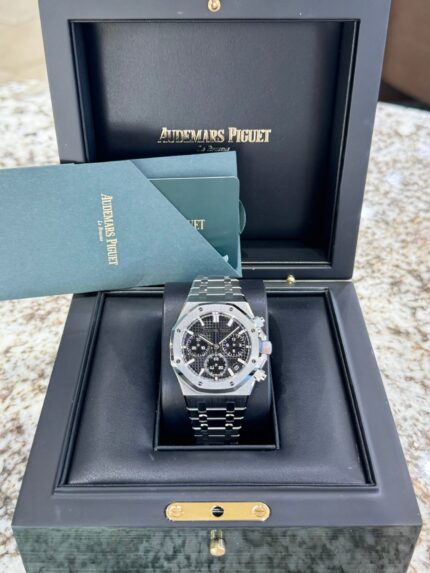 Dial: Black dial with “Mega Tapisserie” pattern, black counters, pink gold applied hour-markers and Royal Oak hands with luminescent coating, black inner bezel