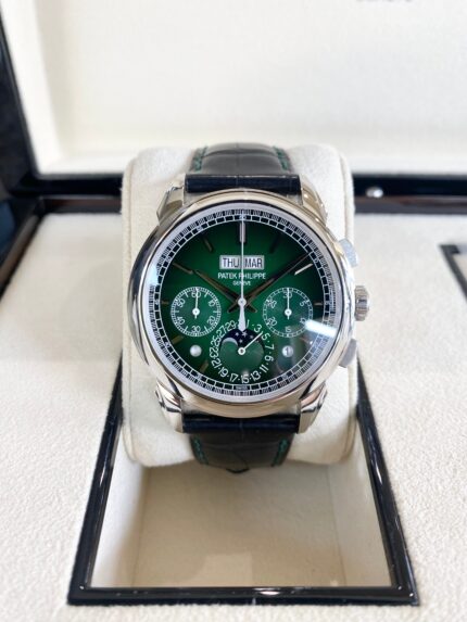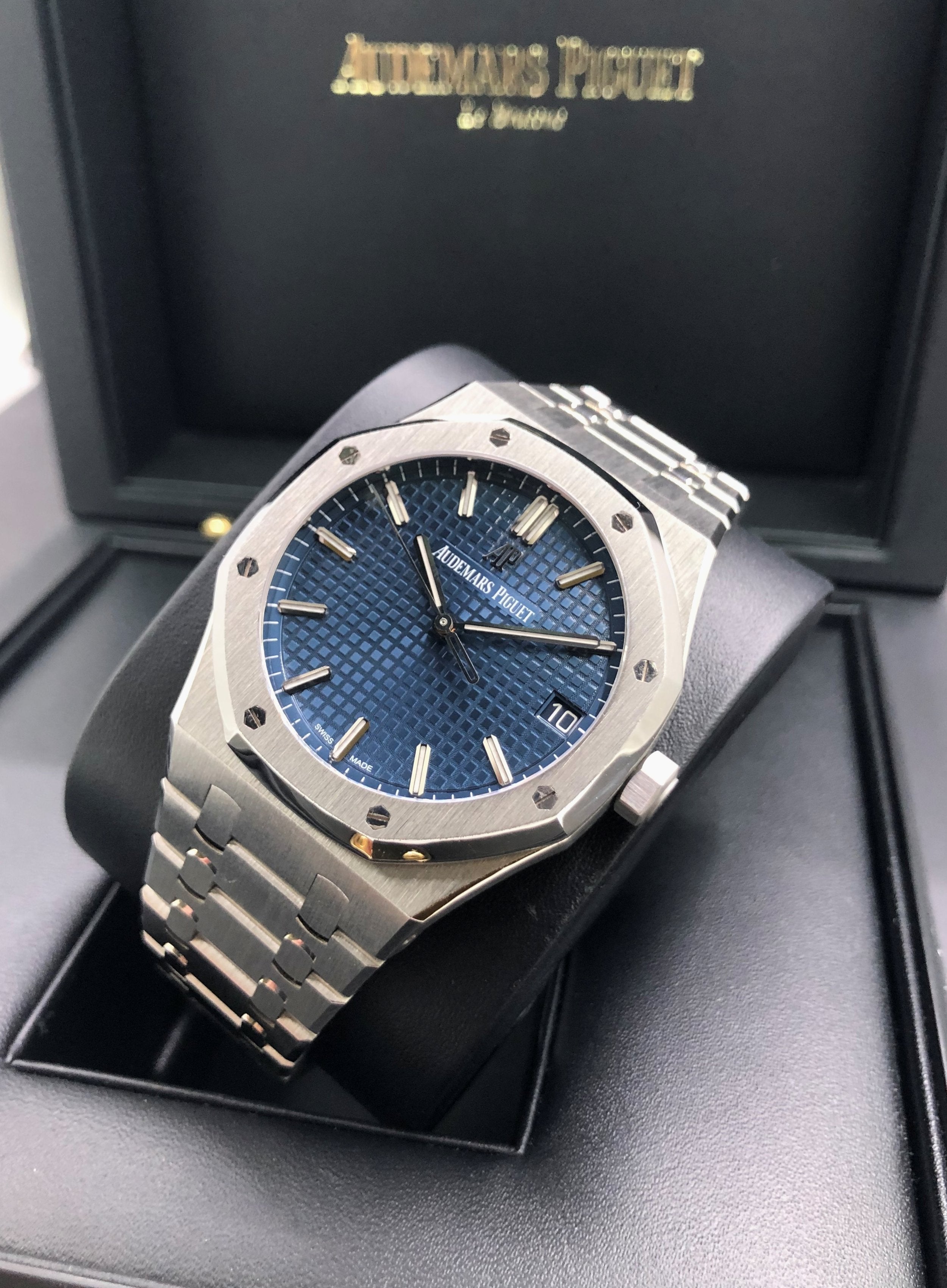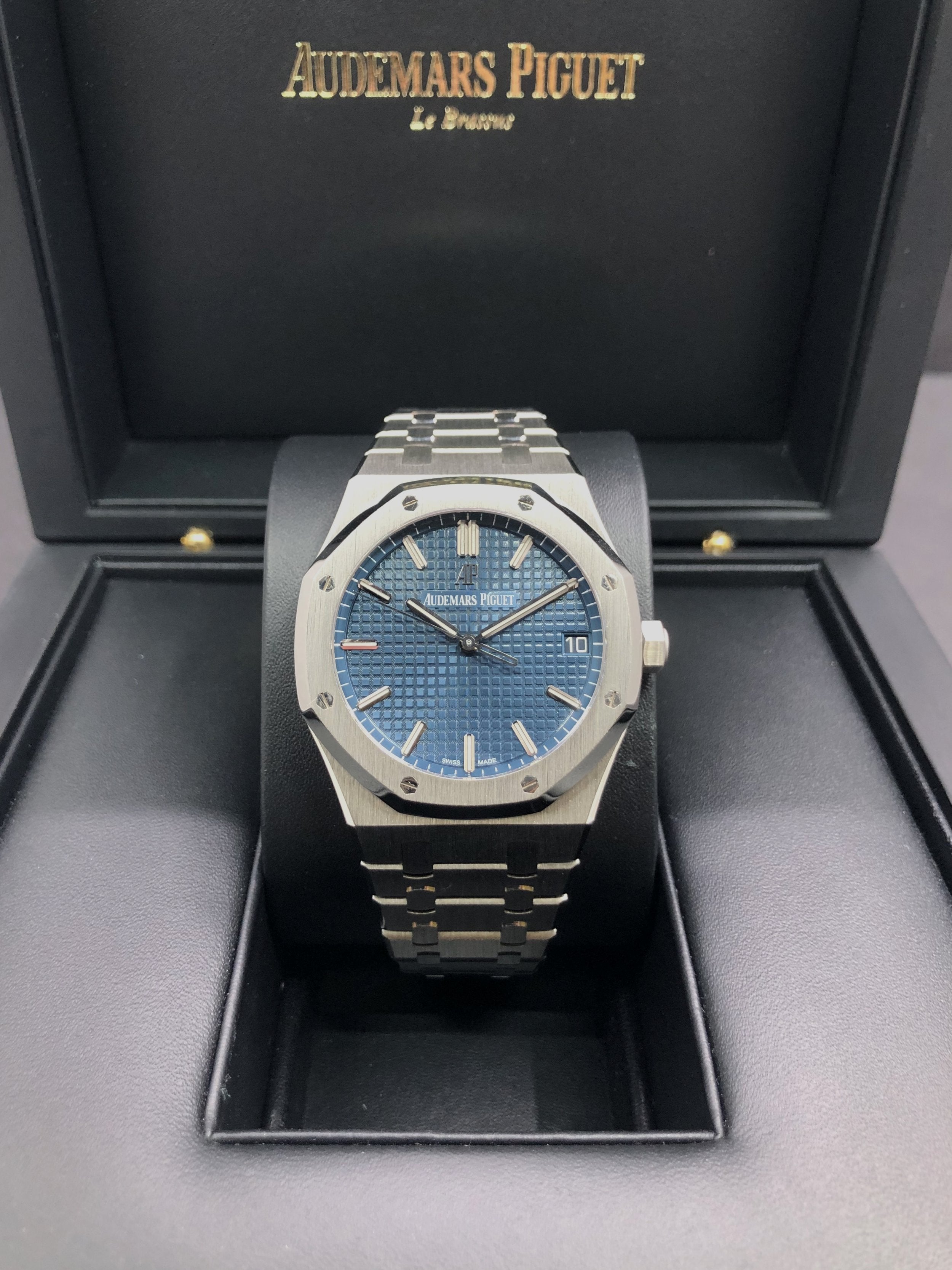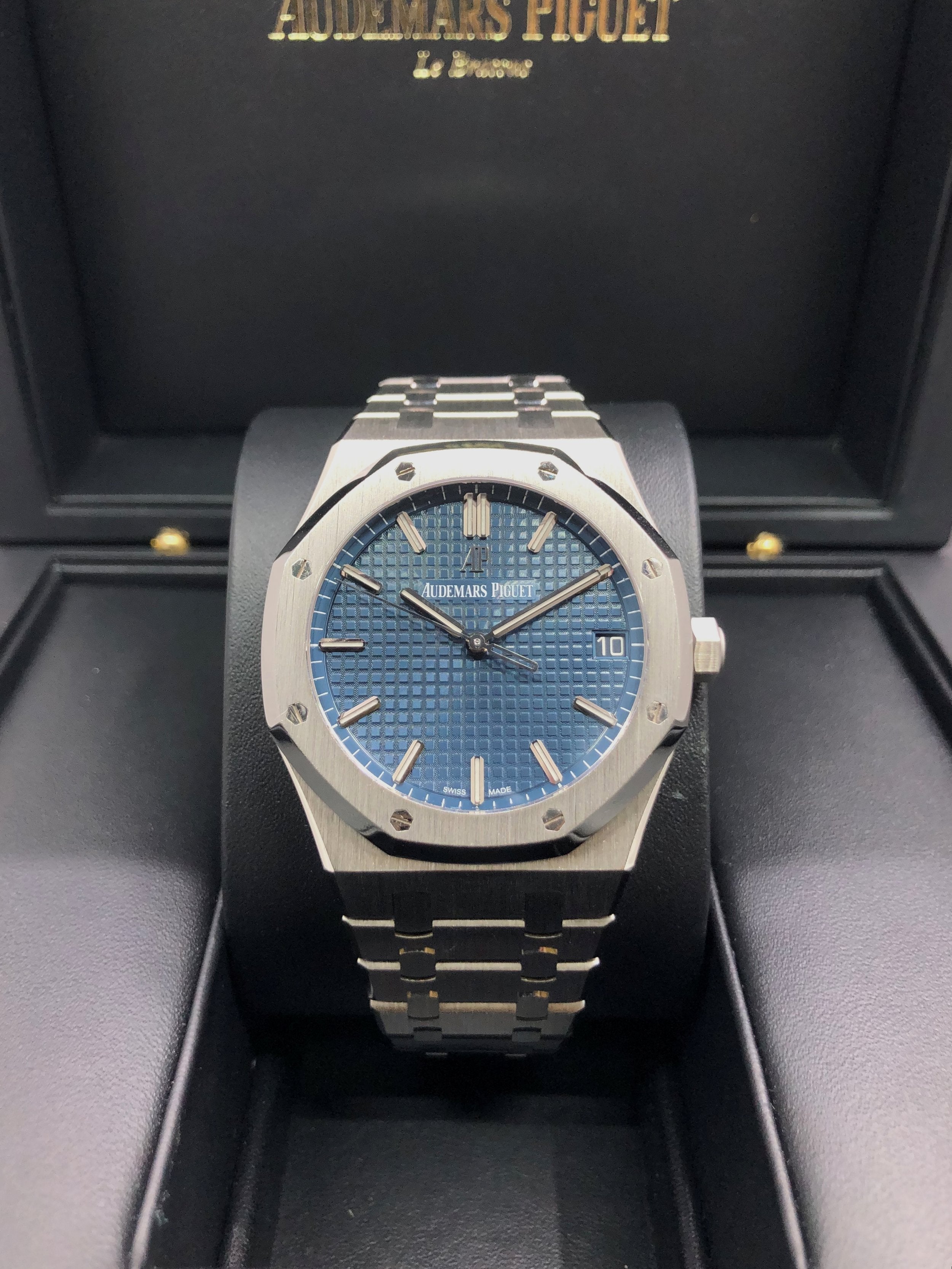 Dial: Blue dial with ‘Grande Tapisserie’ pattern, white gold applied hour-markers and Royal Oak hands with luminescent coating
