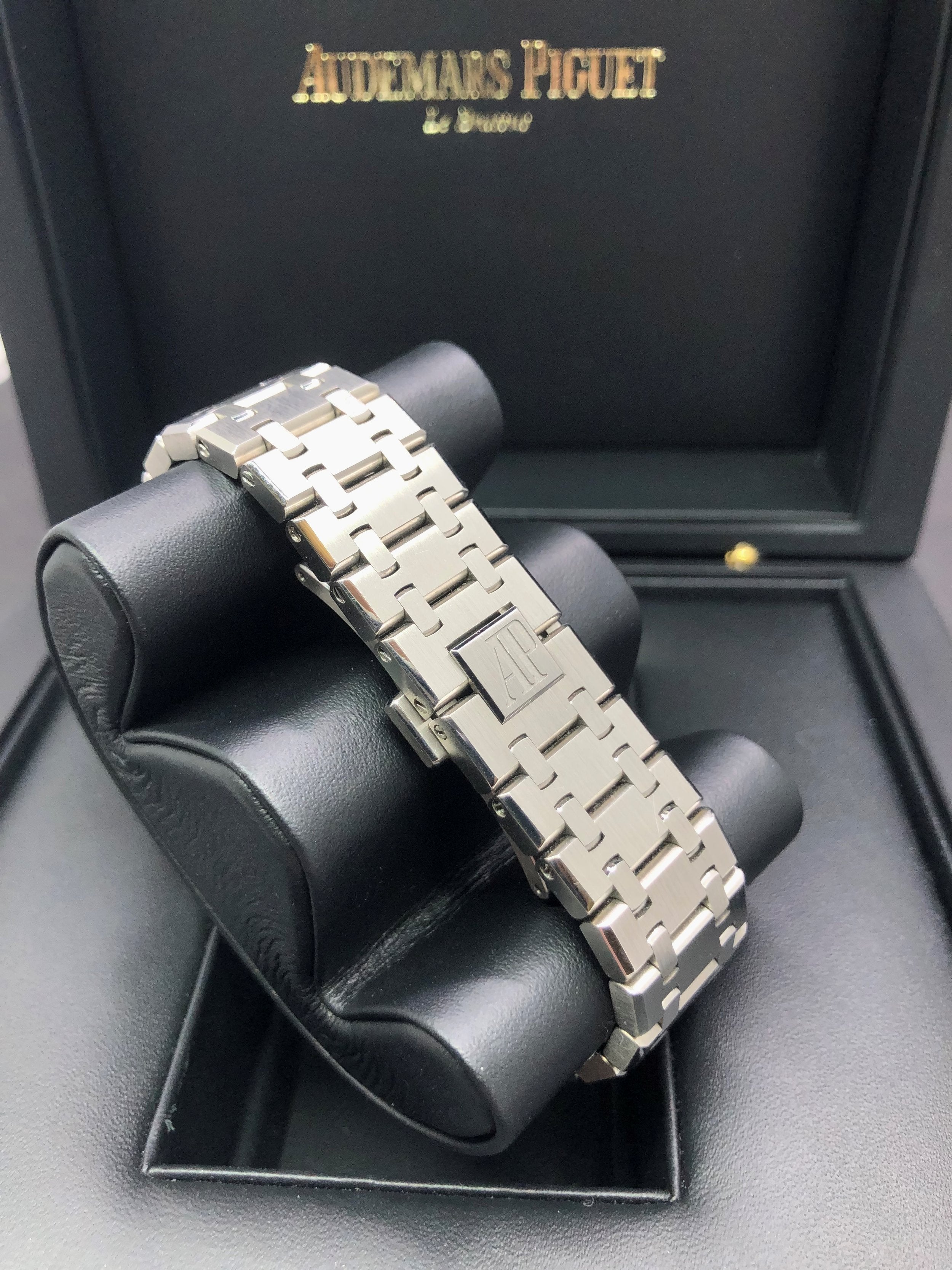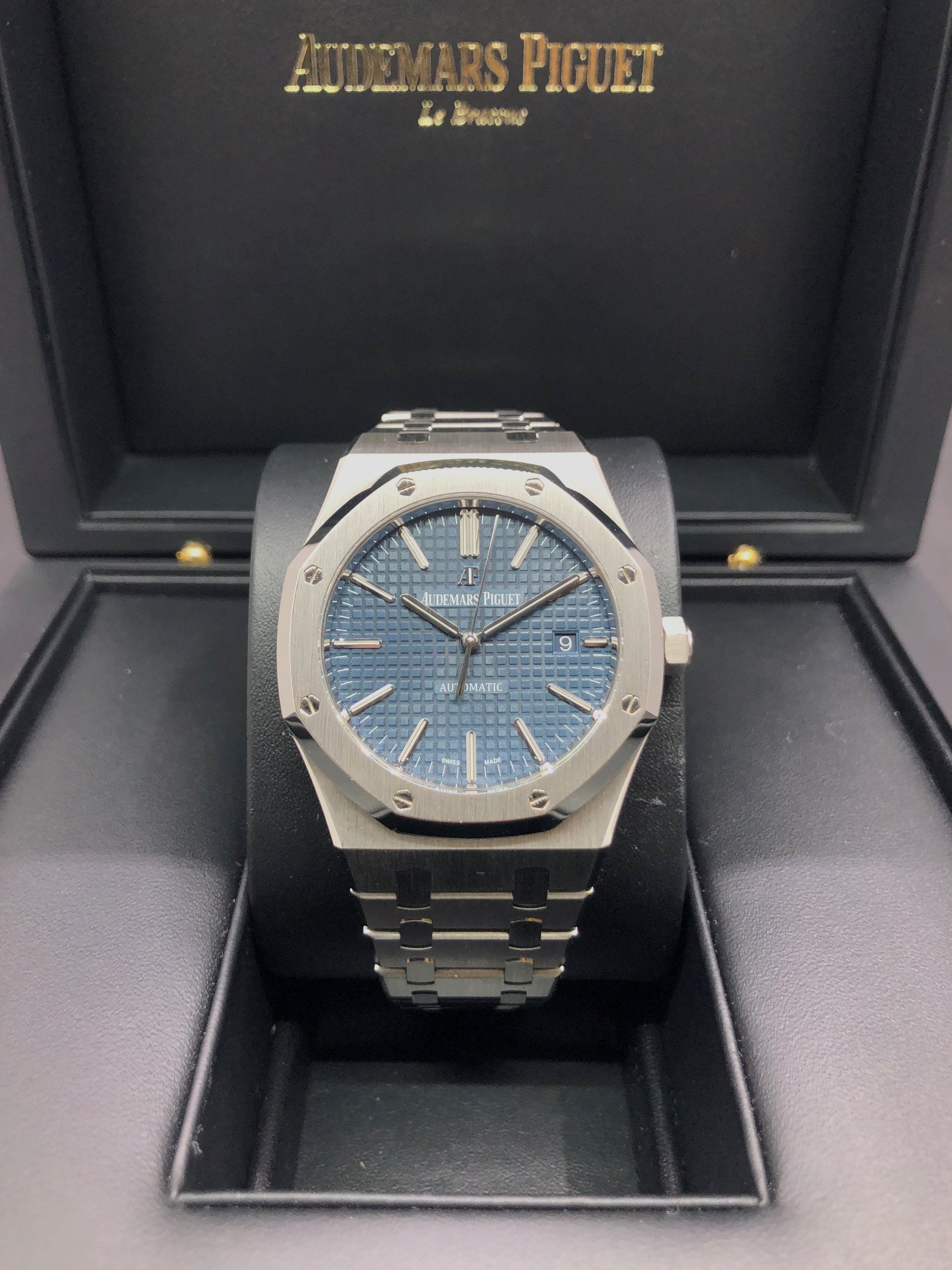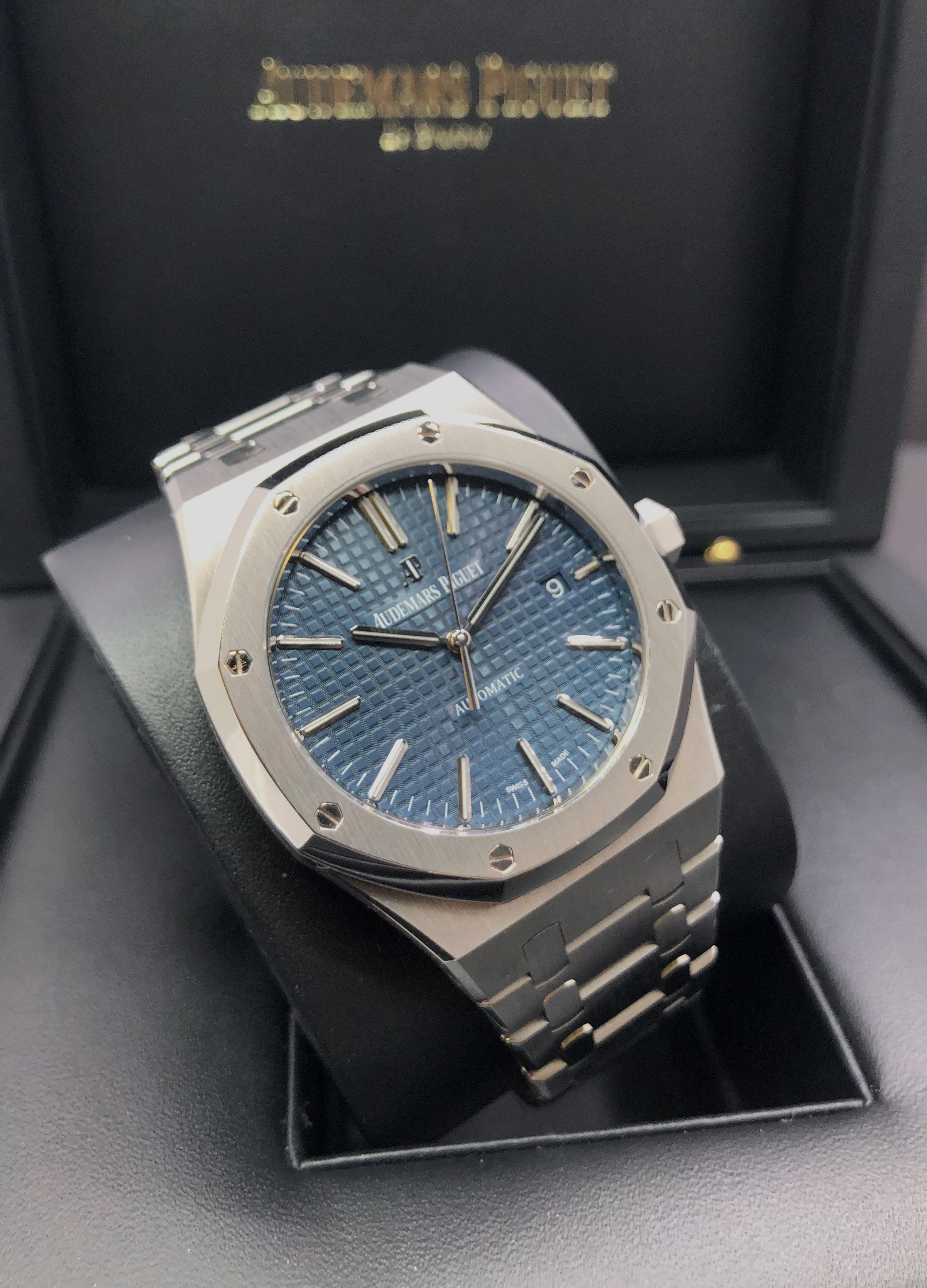 Dial: Blue dial with ‘Grande Tapisserie’ pattern, white gold applied hour-markers and Royal Oak hands with luminescent coating