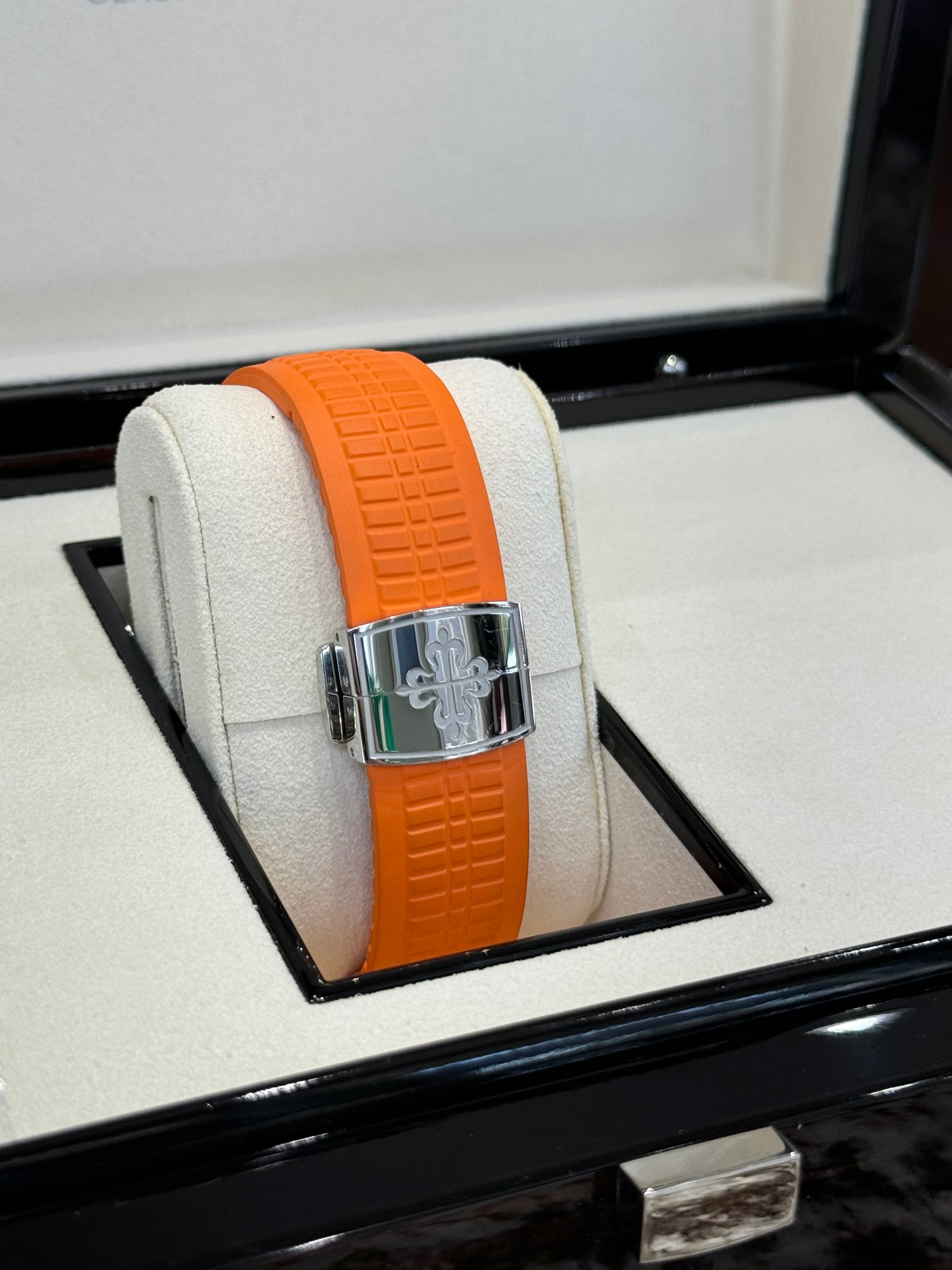 Bracelet: Composite black strap with Aquanaut fold-over clasp, with additional orange composite strap